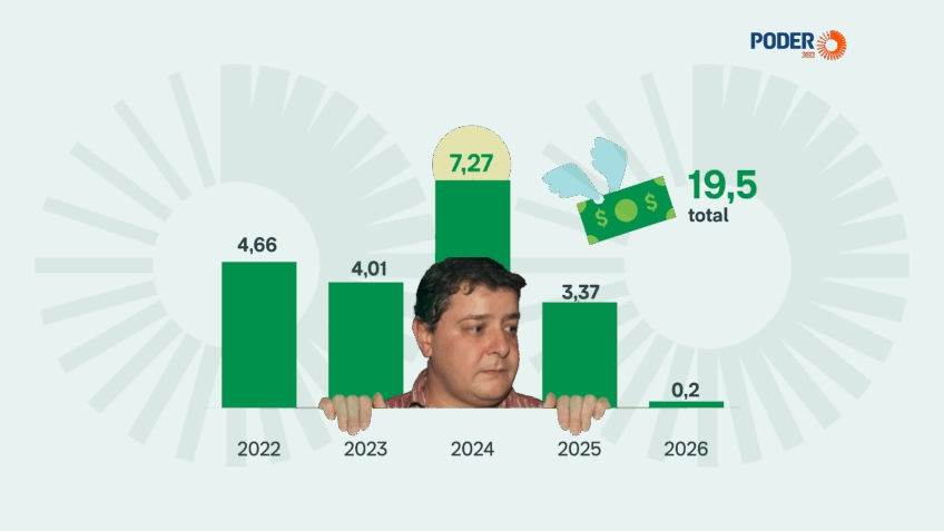 O auge das transações se deu no segundo ano do governo do pai, em 2024, com R$ 7,2 milhões movimentados. Em 2025, o montante caiu para R$ 3,3 milhões. Em 2026, até o dia 30 de janeiro, foram R$ 205.455,96.