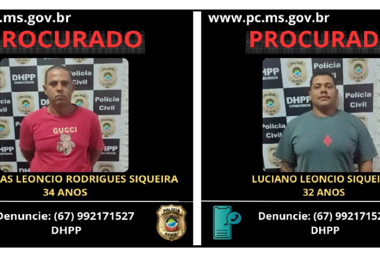 Procurados pela Justiça, João Lucas e Luciano Siqueira são alvos de mandados de prisão temporária expedidos pelo Poder Judiciário. A dupla é investigada por um homicídio e duas tentativas de homicídio ocorridos na madrugada de 1º de março, em uma tabacaria no Bairro Guanandi, em Campo Grande.