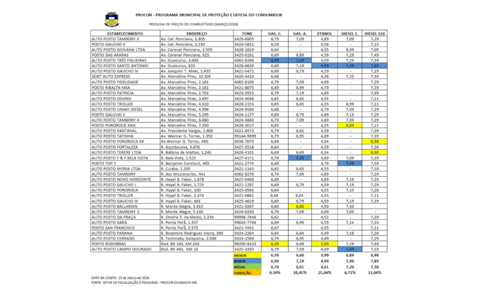 A Prefeitura de Dourados, por intermédio do setor de fiscalização do Procon, realizou nesta segunda-feira (23) mais uma pesquisa de preços de combustíveis no município. O levantamento contemplou 40 estabelecimentos, entre postos localizados na cidade e nos distritos, com o objetivo de comparar os valores do etanol, diesel comum, diesel S10, gasolina comum e gasolina aditivada.