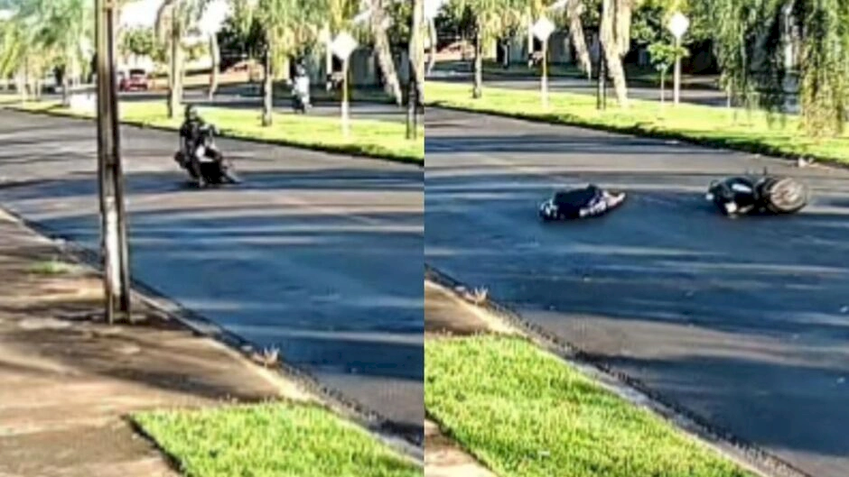 Câmeras de segurança registraram um homem não identificado se acidentando na Avenida Tocantins, em Chapadão do Sul na, na manhã desta quinta-feira (26).