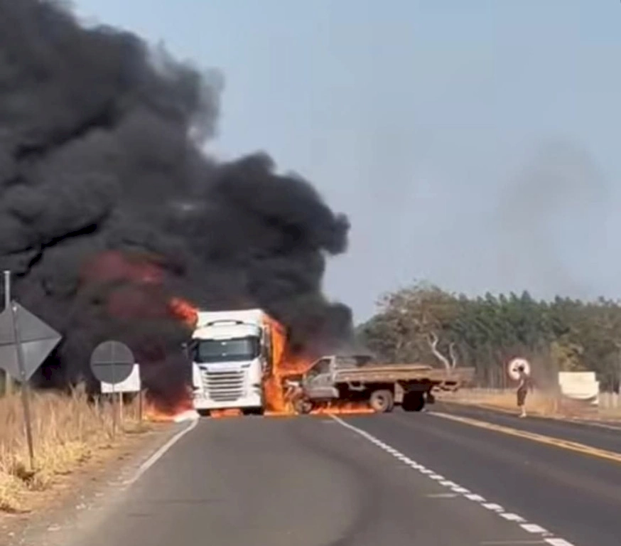 Caminhonete e carreta batem de frente e pegam fogo em rodovia estadual