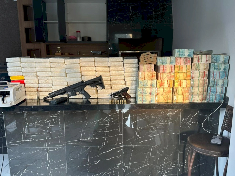 Questionado sobre as armas, ele revelou que a pistola estava no quarto e o fuzil perto da churrasqueira, onde foram encontrados também os tabletes de cocaína e os pacotes de dinheiro. Todo o material foi apreendido, assim como os veículos.
