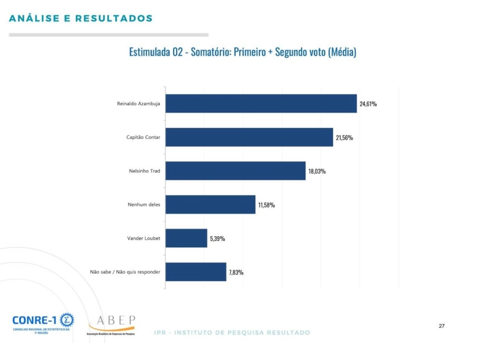 No segundo voto, Reinaldo lidera com 20,72%, seguido por Nelsinho, 13,61%; Contar, 13,33%; Simone, 7,89%; Soraya, 4,28%; Pollon, 4,17%.