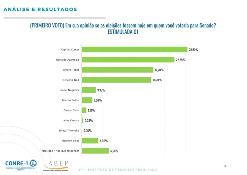 Na próxima eleição serão escolhidos dois novos senadores e o instituto perguntou de quem seria o primeiro voto. Contar foi o mais citado, com 25,50%, seguido por Reinaldo, com 22,39%; Simone, com 17,28%; e Nelsinho, com 16,78%.