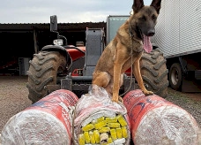 Durante a inspeção com apoio dos cães farejadores K9-Colt (Denar) e K9-Bart (PM-Choque), os animais indicaram presença de entorpecentes em três volumes que tinham o estado de São Paulo (SP) como destino.