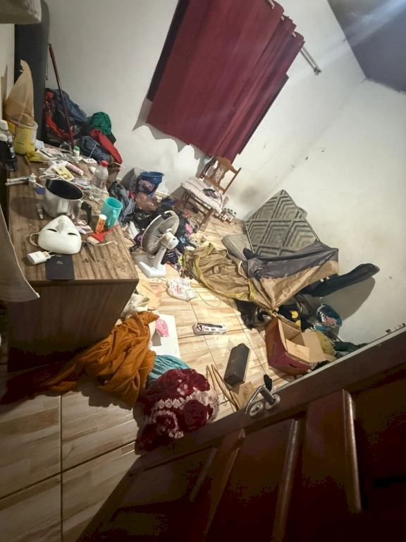 Após o registro da ocorrência, a equipe policial acompanhou a vítima até sua residência, onde constatou que a porta da cozinha e do quarto da idosa haviam sido arrombadas e que uma motocicleta Honda Biz, pertencente a ela, havia sido levada.