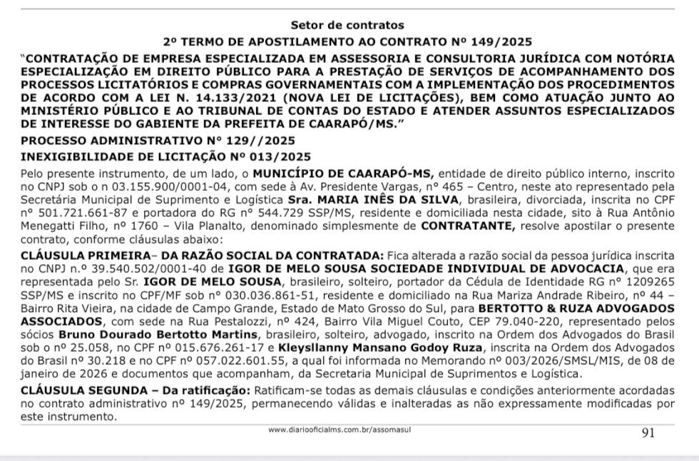 O trecho publicado em edital detalha a substituição da empresa Igor de Melo Sousa Sociedade Individual de Advocacia pela sociedade Bertotto & Ruza Advogados Associados, representada por dois novos sócios. O documento foi assinado em 22 de janeiro de 2026 pela secretária municipal de Suprimentos e Logística, Maria Inês da Silva, e ratifica todas as demais cláusulas do contrato original.